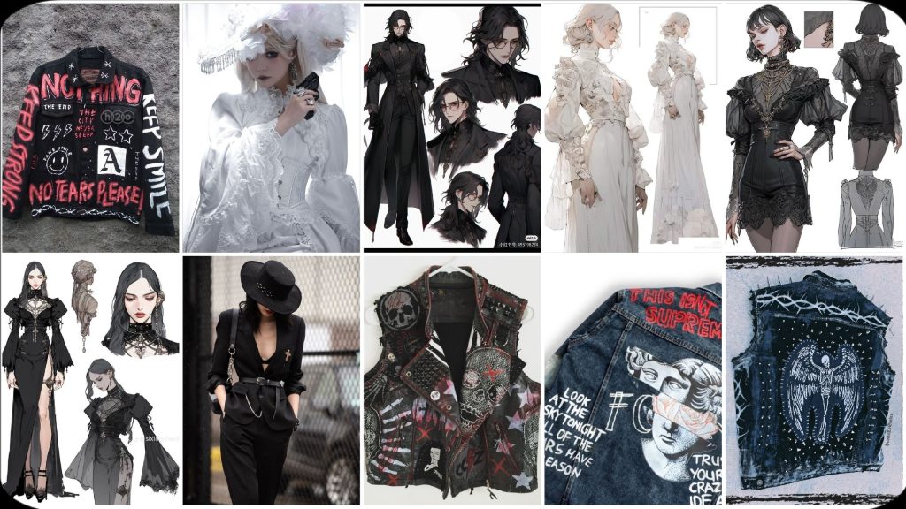 - Сочетание металлических элементов (молнии, заклепки, цепи) с романтическими мотивами (розы, кружева)